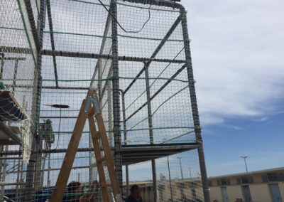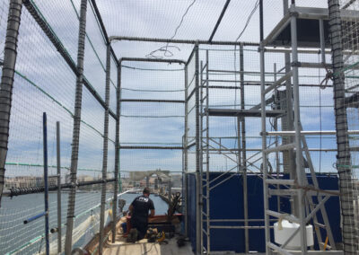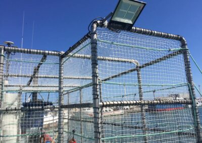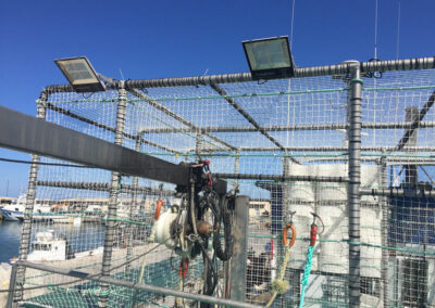 Las jaulas para nansas están diseñadas para alojar las nansas (cestas cilíndricas usadas para pescar) de forma eficiente y segura, ayudando a mantener el barco organizado y permitiendo a los marineros realizar sus tareas cómodamente. Estas jaulas facilitan el almacenamiento y manejo de las nansas durante las operaciones de pesca.